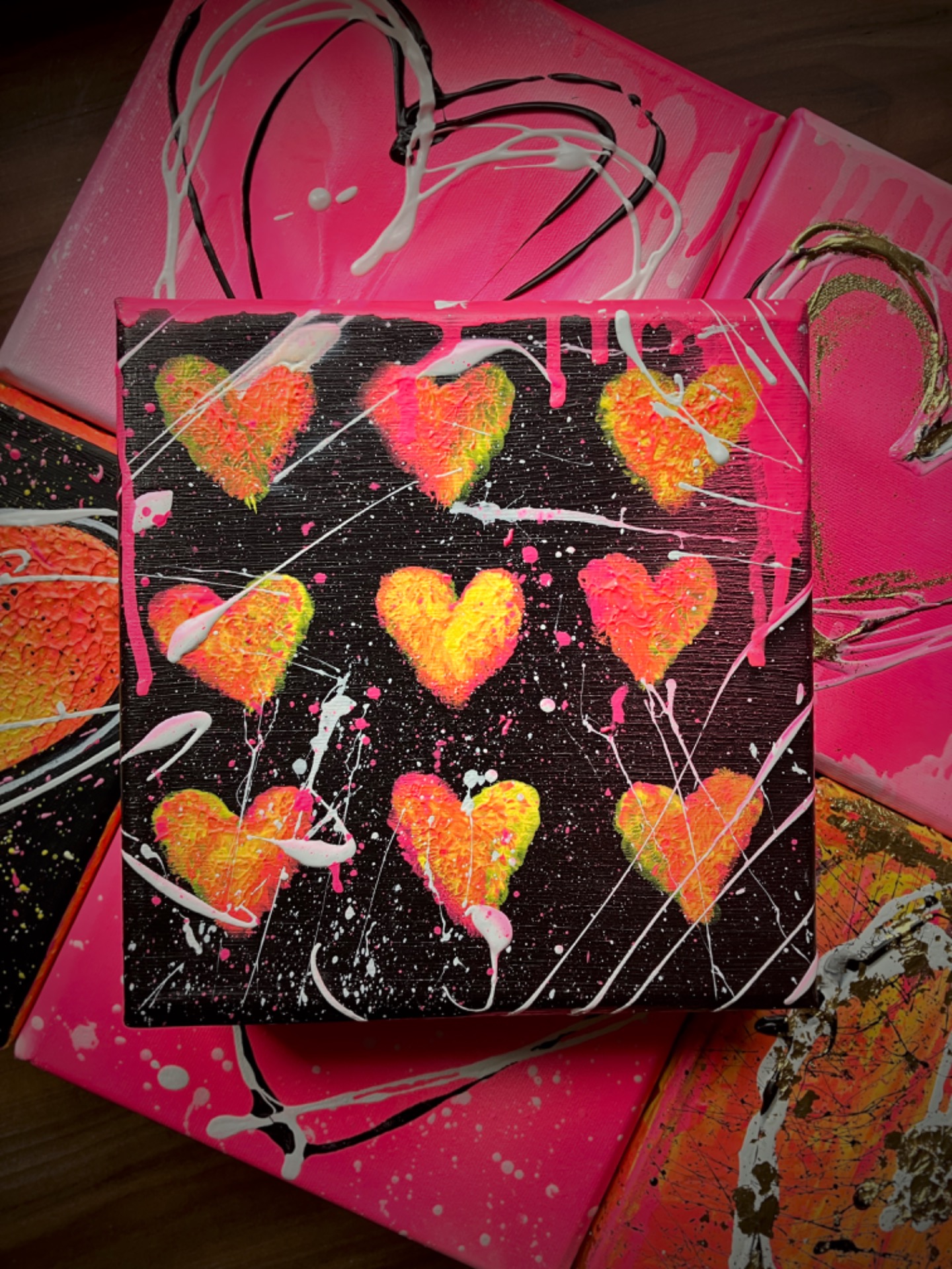 Každý obraz je abstraktní výbuch barev. Zářivé neonové tóny v kontrastu s černou, cákance, spreje a rozteklé linie, které vytvářejí symbol srdce. To srdce není dokonalé. Není rovné. Je opravdové, tak jako skutečná láska.
